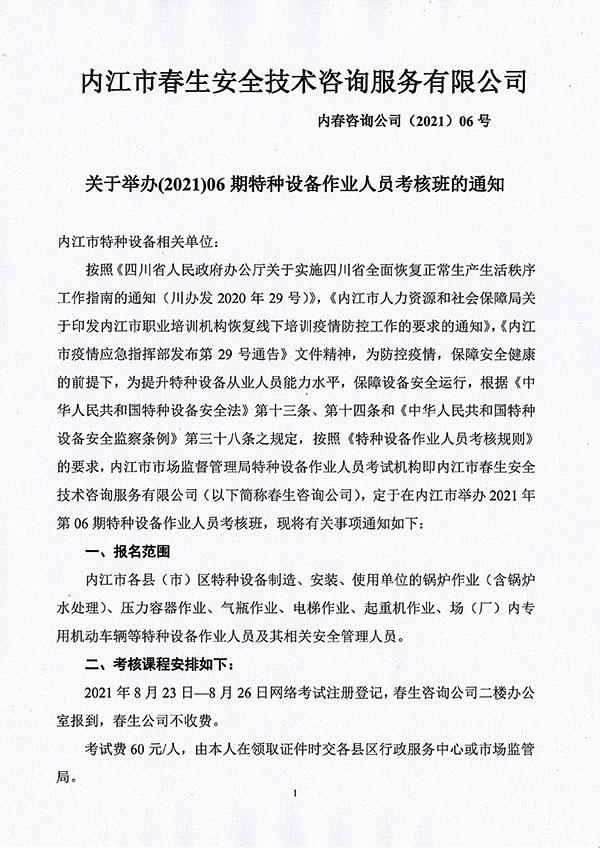 2021年春生公司06期特種設(shè)備作業(yè)人員考核班通知