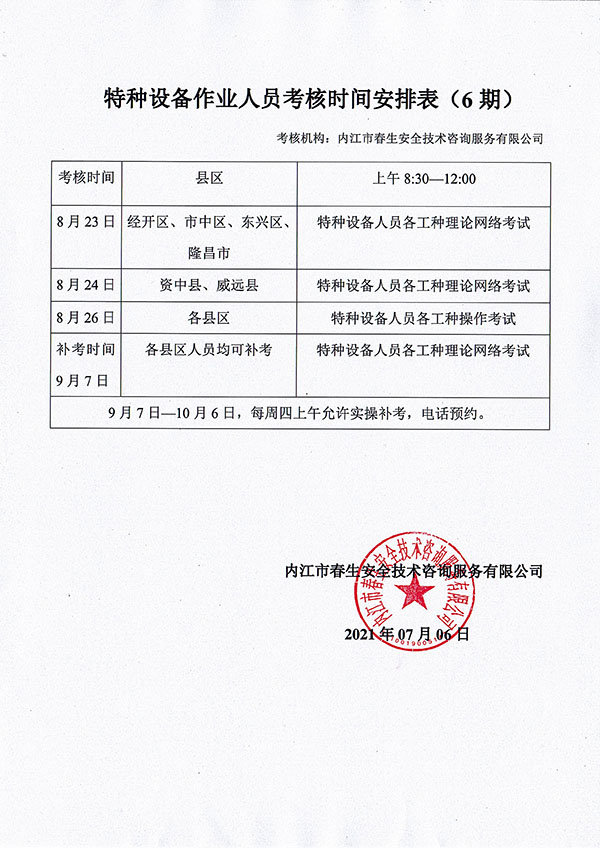 2021年春生公司06期特種設(shè)備作業(yè)人員考核時間安排