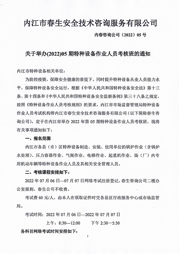 2022年春生公司05期特種設(shè)備作業(yè)人員考核時(shí)間安排