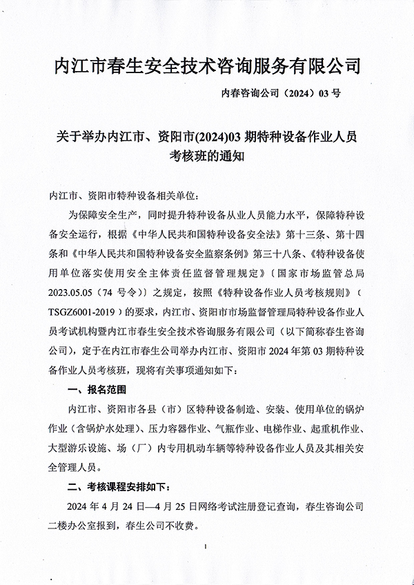 關(guān)于舉辦內(nèi)江市、資陽市(2024)04期特種設(shè)備作業(yè)人員 考核班的通
