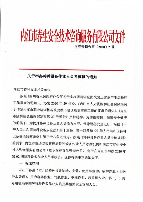 2020年第一期特種設備作業(yè)人員考核培訓班的通知